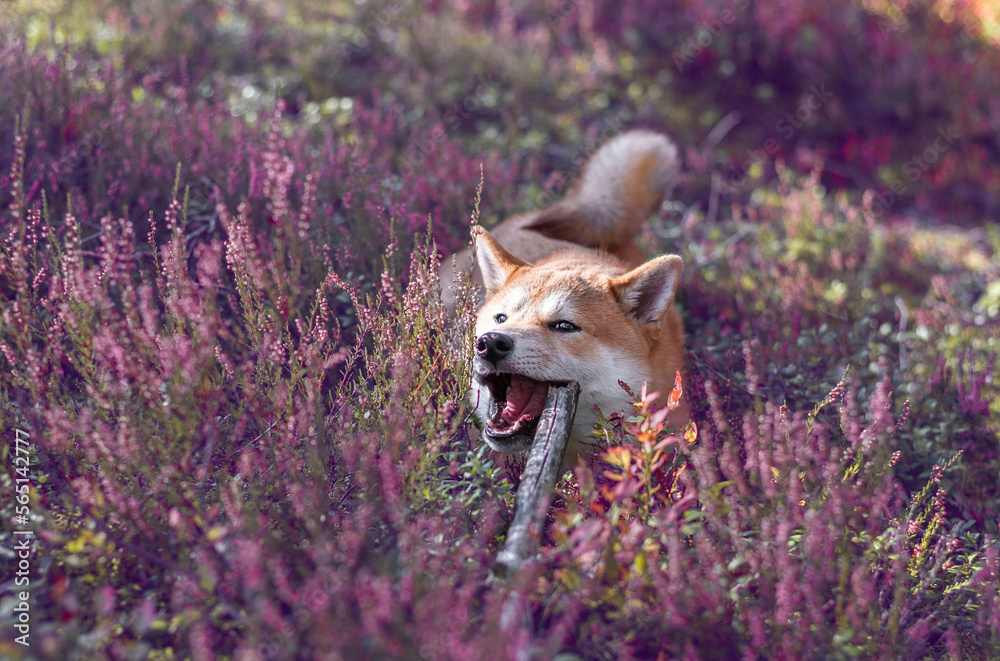 Shiba inu puppy is gnawing wooden stick in the forest