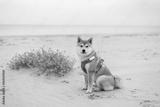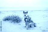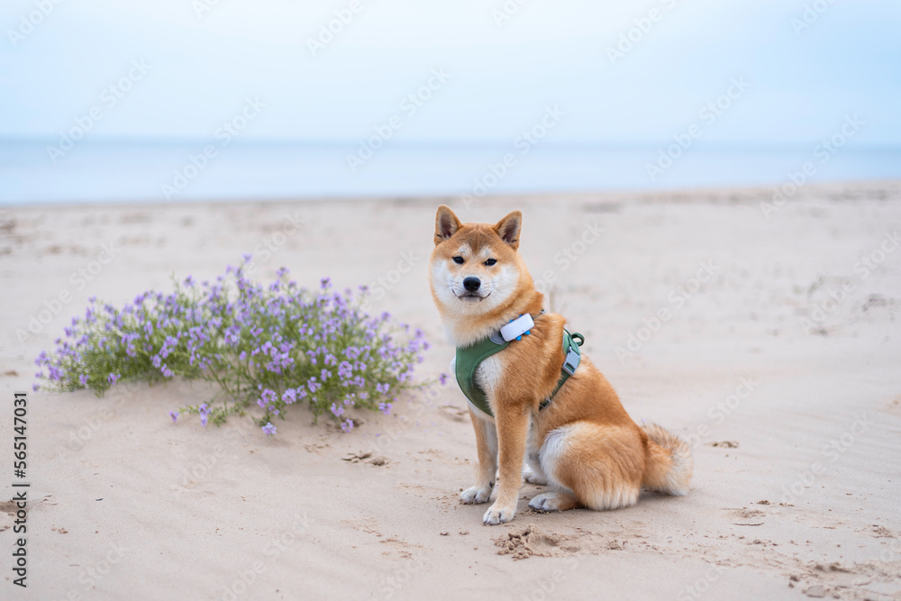 Shiba inu dog is sitting on sandy Baltic sea beach next to beatiful purple flowers