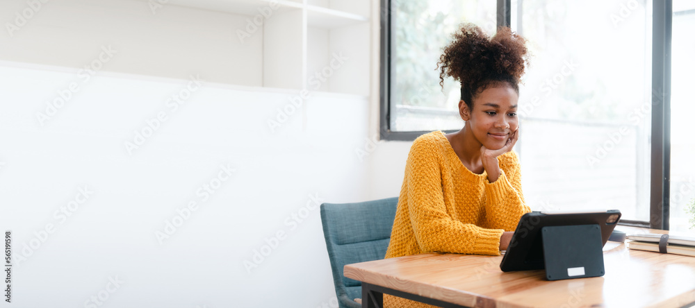 Pretty young african american student woman study online class in tablet video call zoom teacher learning english language experiment in knowledge-gathering from any location of their choice.