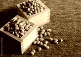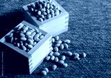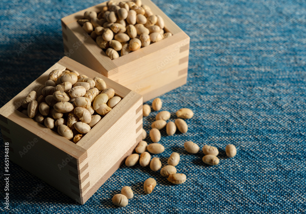 Fukurimame in a wooden bowl placed on a blue cloth.