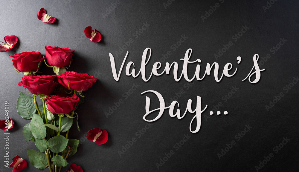 Love and Valentine's day concept made from red rose and the text on black wooden background.