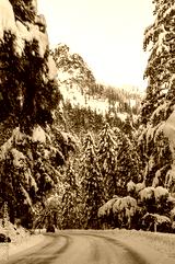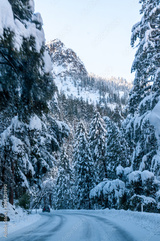 A snow-covered winter landscape along the road from Yosemite Valley to Mariposa grove.