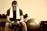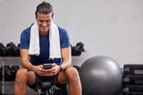 Fitness, phone or man on social media to relax at gym in training, workout or exercise resting on a break. Tired, happy or healthy sports athlete typing text on a bench and exercising for body goals