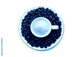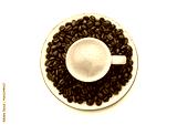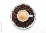 Espresso coffee in small cup and fresh raw beans on saucer on white background