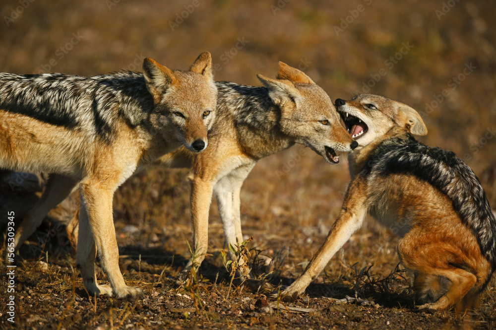 Black-backed jackal or silver-backed jackal (Lupulella mesomelas) showing submissive behaviour. MlMashatu, Northern Tuli Game Reserve. Botswana