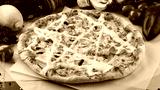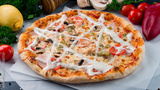 Italian pizza with mushrooms, tomatoes, ham, pickled cucumber, cheese and sauce.