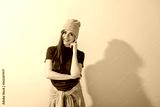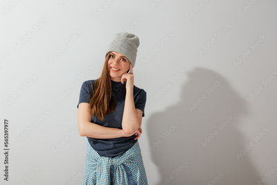 Thinking teen girl in casual clothes and beanie.