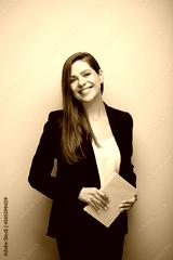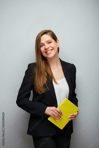 Smiling woman adult student holding yellow book. Isolated business lady portrait with black suit.