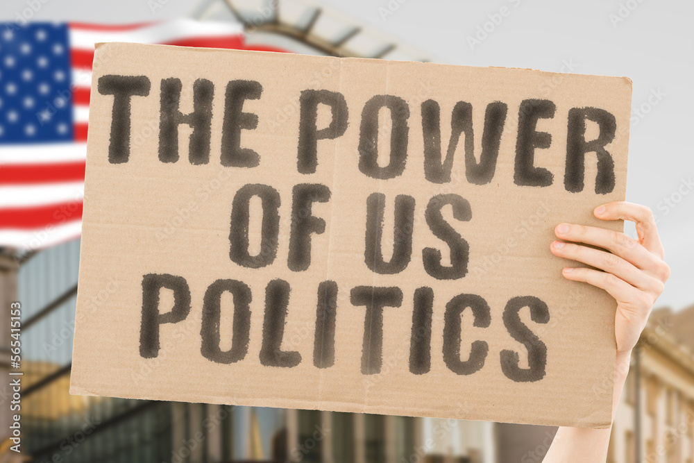 The phrase " The Power of US Politics " is on a banner in men's hands with blurred background. Diplomacy. Intervention. Sanctions. Legislation. Regulation. Taxation. Spending. Funding. Military