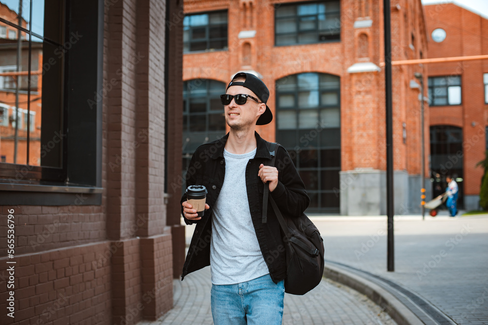 Portrait of a stylish hipster guy in sunglasses with a backpack in the city against the background of a modern city building.