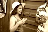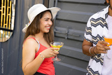 Beautiful young indian woman tourist wearing hat drink cocktails having fun. Happy girl enjoying fresh juice, Summer Vacation and holiday concept.