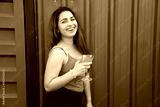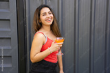 Beautiful Portrait of smiling young indian woman drink cocktails having fun. Happy multi ethnic girl enjoying fresh orange juice, Summer Vacation and holiday concept.