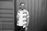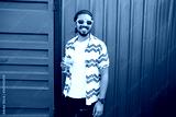 Happy Portrait of young indian man wearing sunglasses and white shirt drink cocktails having fun. Multiethnic male guy enjoying fresh orange juice, Summer Vacation and holiday concept.