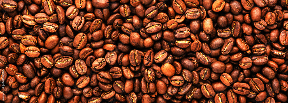 Coffee beans, food background and texture from freshly roasted arabica coffee beans, top view horizontal banner