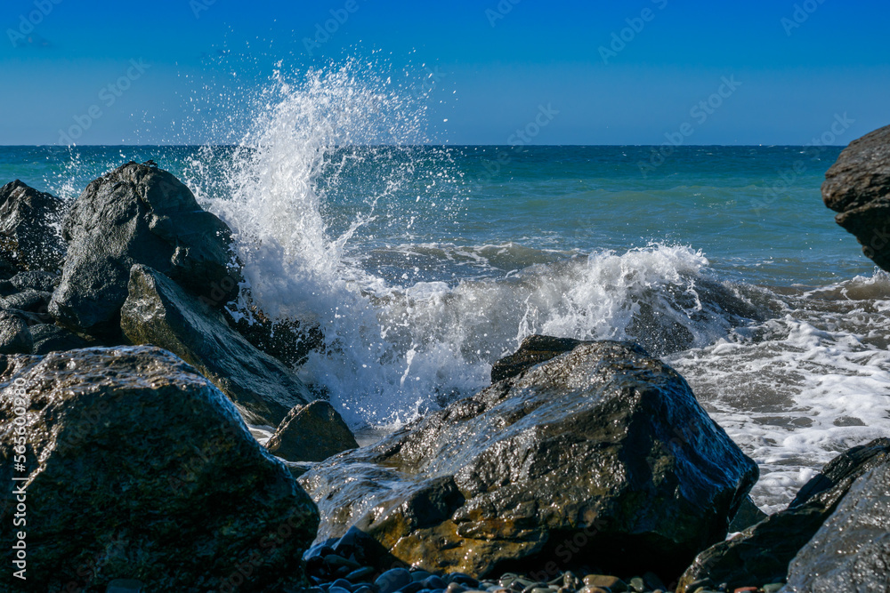 Splashing big wave crashing into the rocks in the rough wild water of the Atlantic Ocean