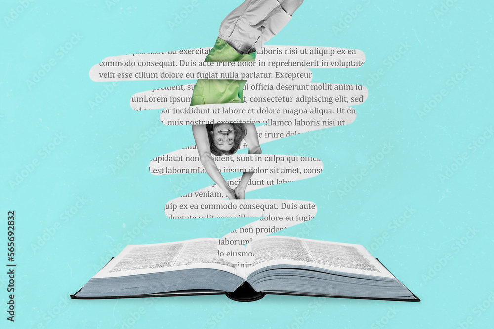 Creative retro 3d magazine collage image of funny funky guy diving book world isolated painting background
