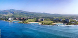 Panorama of the resorts on the west side of Oahu, Hawaii and its resort hotels, parks and lagoons