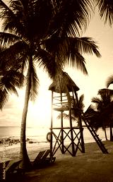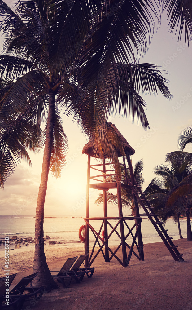 Silhouette of a tropical beach at sunset, color toning applied.