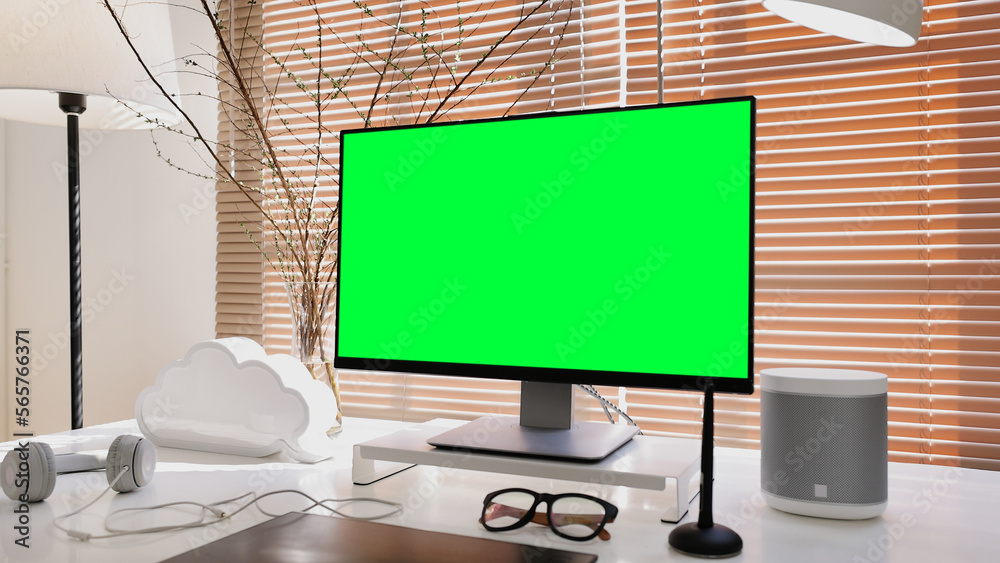 Blank wide green mock up screen desktop computer monitor standing on table in the modern creative office.