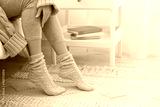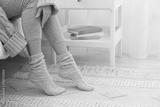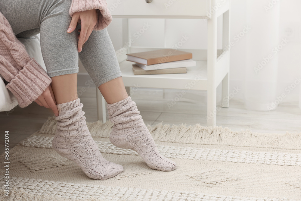 Woman wearing warm knitted socks at home, closeup. Space for text
