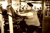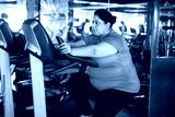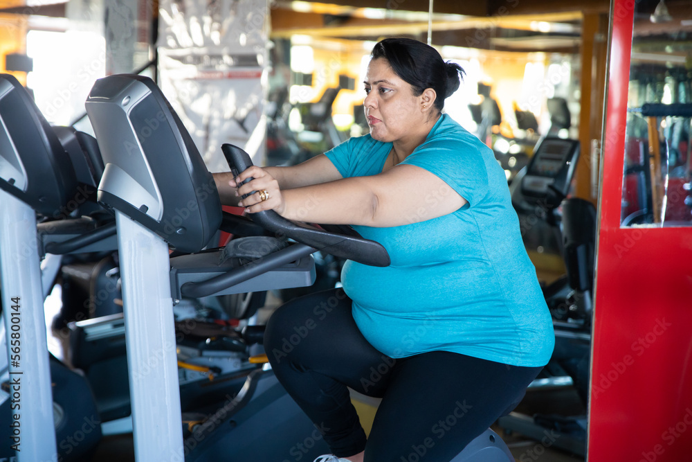 Young overweight indian woman is workout in gym to lose weight. Asian female doing cardio training on modern bike bicycle machine.