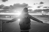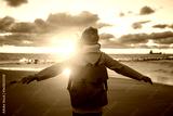 Happy tourist in a yellow jacket enjoying sea landscape at sunset. Lifestyle, travel, tourism, nature, active life.