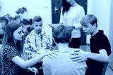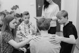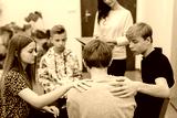 Group of teenagers sitting in a circle and comforts a colleague during a class with a psychologist