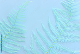 Top view image of pastel dry fiddlehead ferns over blue background .Flat lay