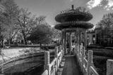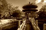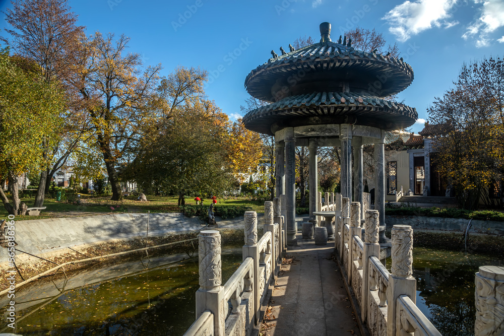 Beautiful round gazebo over the pond. Sunny autumn day. Colorful nature. Ancient Japanese architecture.