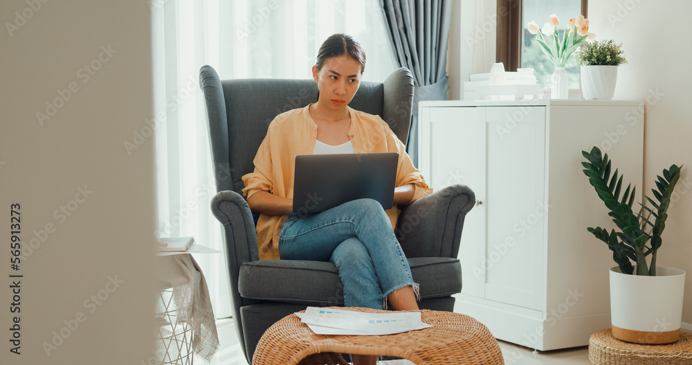 Young attractive asian female girl or university student sit on sofa chair with computer laptop feel focus and serious look on screen and thinking idea work report in living room at cozy home.