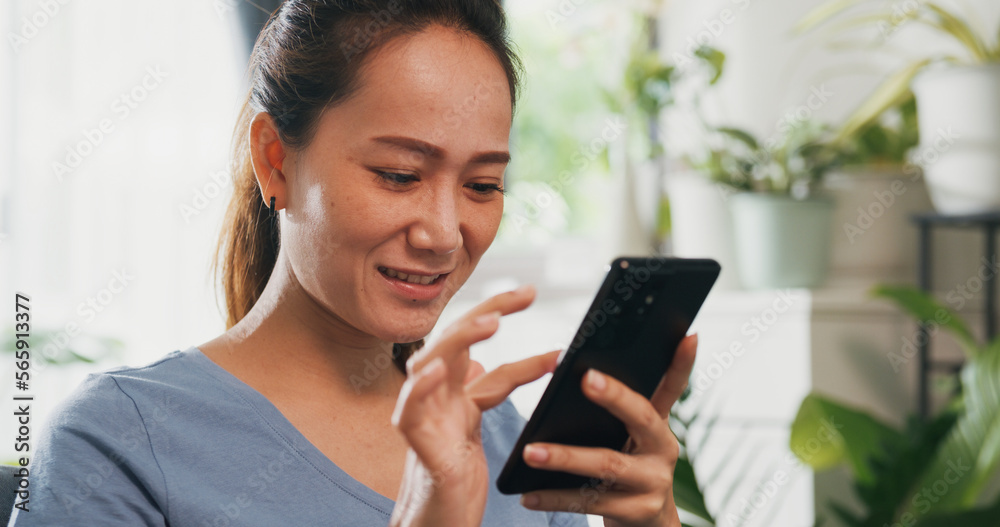 Close-up Young Asian woman wear casual site on couch use smartphone feel exciting scrolling screen online shopping in living room indoor plants at home. Excited and surprised female holding cellphone.