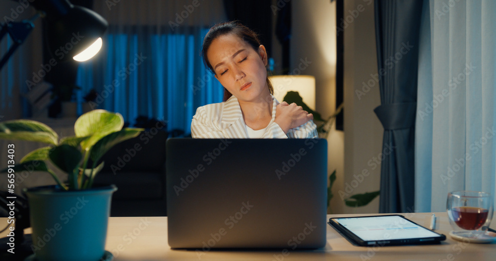Young Asian businesswoman wear formal with tablet and tea cup focus laptop work report feel tired from overwork take rest raise arm stretch muscle in living room at home night. Overtime work concept.