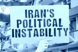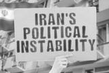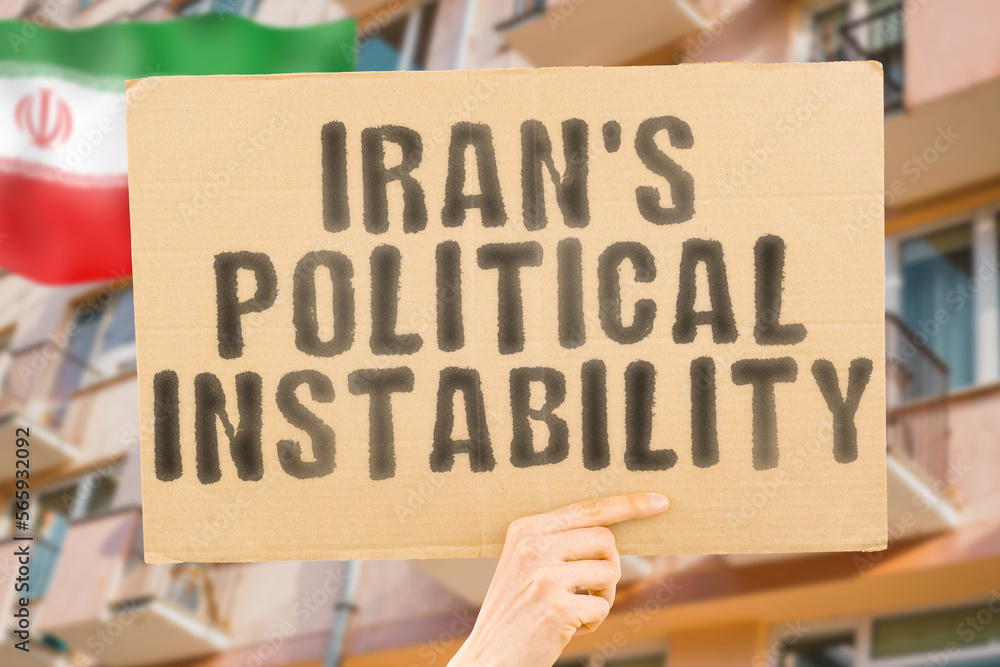 The phrase " Iran's Political Instability " is on a banner in men's hands with blurred background. Danger. Indecision. Insecurity. Catastrophe. Improvement. Disaster. Adaptation. Cataclysm. Change