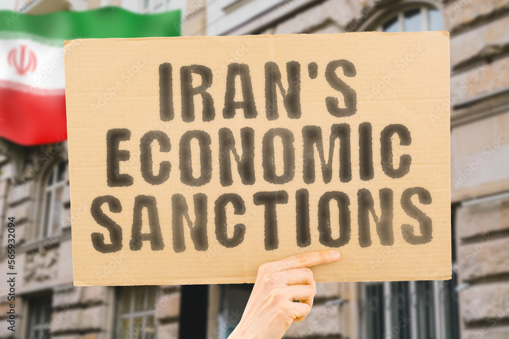 The phrase " Iran's Economic Sanctions " is on a banner in men's hands with blurred background. Manufacturing. Exportation. Import. Supply. Demand. Shortage. International. Diplomacy. Negotiation