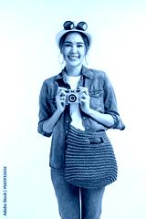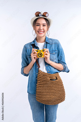 ready to travel ,young teen asian smiling cheerful female woman casual cloth hand hold camera standing with luggage case bag prepare to new abroad journey travel studio shot on white background