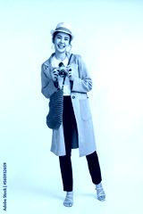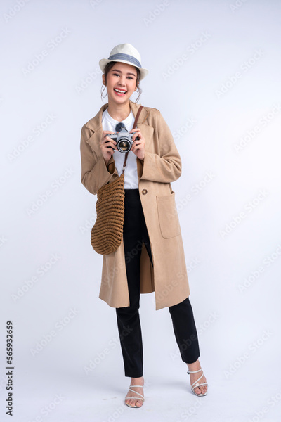 ready to travel ,young teen asian smiling cheerful female woman casual cloth hand hold camera standing with luggage case bag prepare to new abroad journey travel studio shot on white background