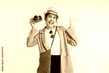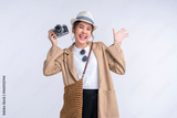 ready to travel ,young teen asian smiling cheerful female woman casual cloth hand hold camera standing with luggage case bag prepare to new abroad journey travel studio shot on white background