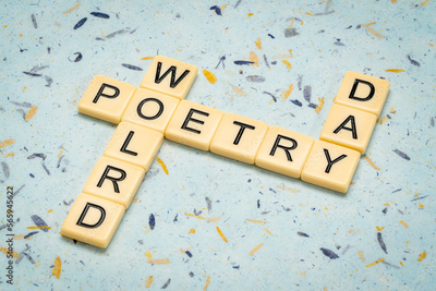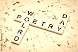 World Poetry Day - crossword against handmade art paper, reminder of annual cultural event, March 21