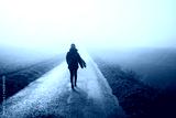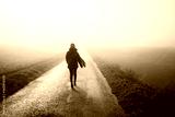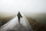 Lonely courageous woman walks on empty road in fog. Journey to unknown place and future