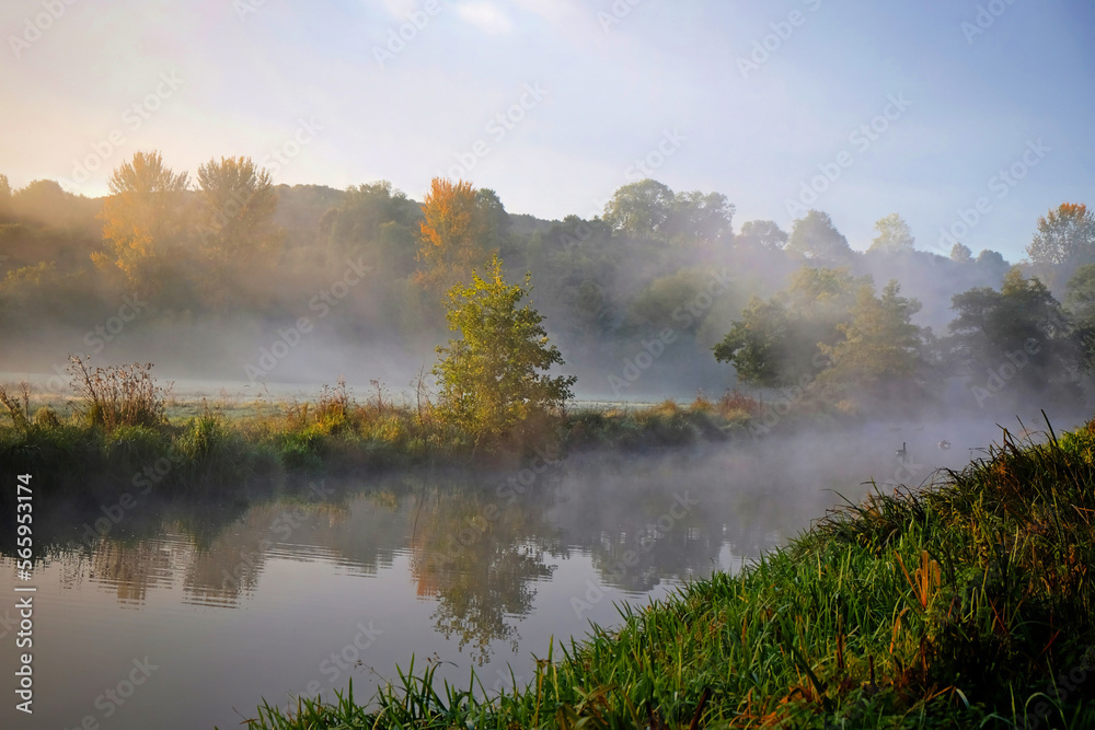 Mist over the meadows of the River Wey, Guildford, Surrey, UK
