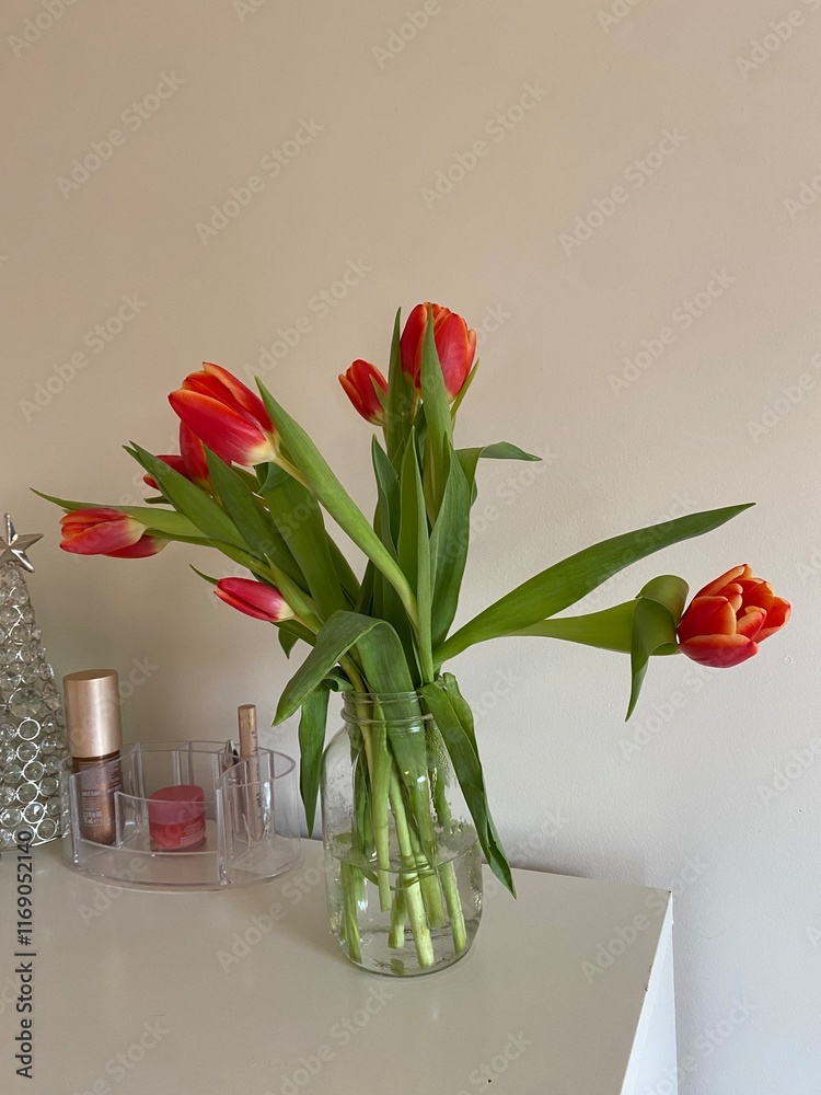 Set of different makeup cosmetics on blue background. White makeup bag and cosmetic beauty products. Flat lay, top view, copy space