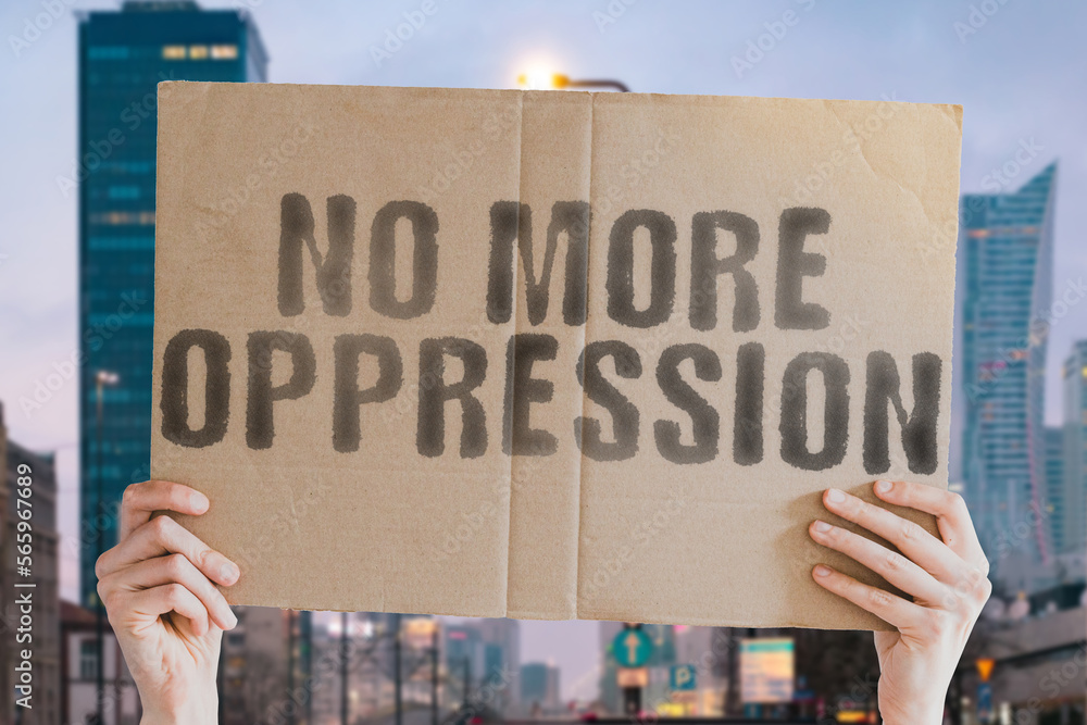The phrase " No more oppression " is on a banner in men's hands with blurred background. Prevailing. Advocate. Prevails. Freedom. Justice. Democracy. Equality. Strength. Unity. Solidarity. Dignity