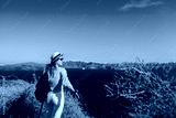 Traveler woman walking on Santorini island, Greece enjoying landscape. Happy hiker enjoys Caldera view