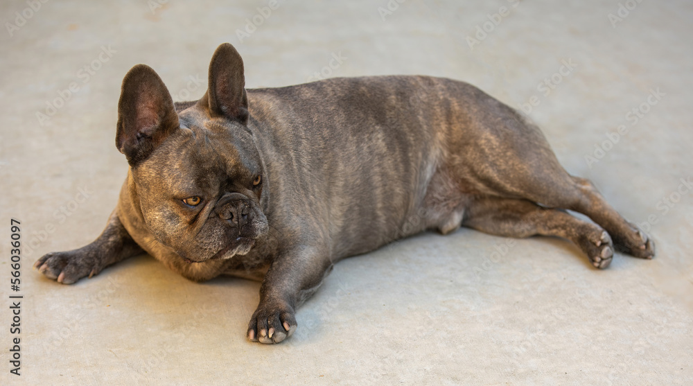 6-Year-Old Brindle Male Frenchie Lying Down and Looking Away. Concrete Patio in Northern California.