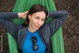 Smiling woman in casual clothes resting in a hammock outdoors in the weekend