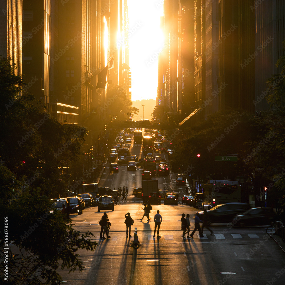 People, cars, buses and taxis crowded together on 42nd Street in Manhattan New York City with the light of sunset shining between background buildings