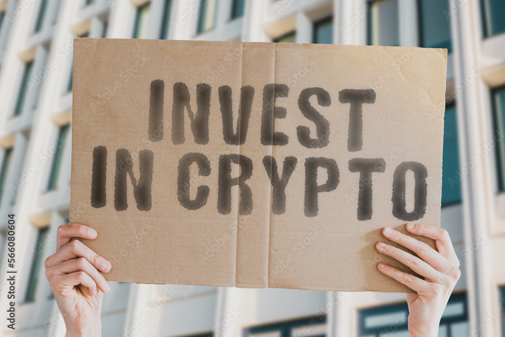 The phrase " Invest in Crypto " is on a banner in men's hands with blurred background. Favorable. Shield. Yield. Progression. Currency. Investing. Finance. Risk. Strategy. Selling. Supply. Foundation