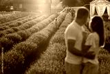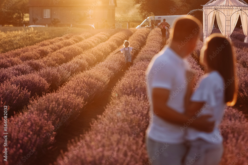 happy family day. young father, mother and child daughter are having fun together in the lavender field on sunset. happy couple with kid enjoy summer holiday vacation. family look