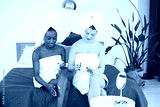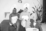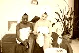 Two young teenage girls sitting on a bed wearing bathrobes and applying creams