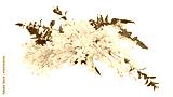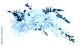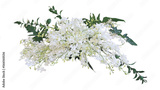 Tropical plant bush floral arrangement with white dendrobium orchids tropical flowers and tropical leaves philodendron and ruscus leaves.